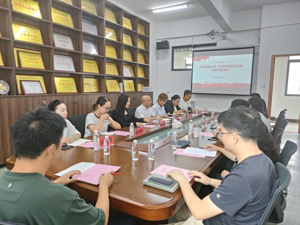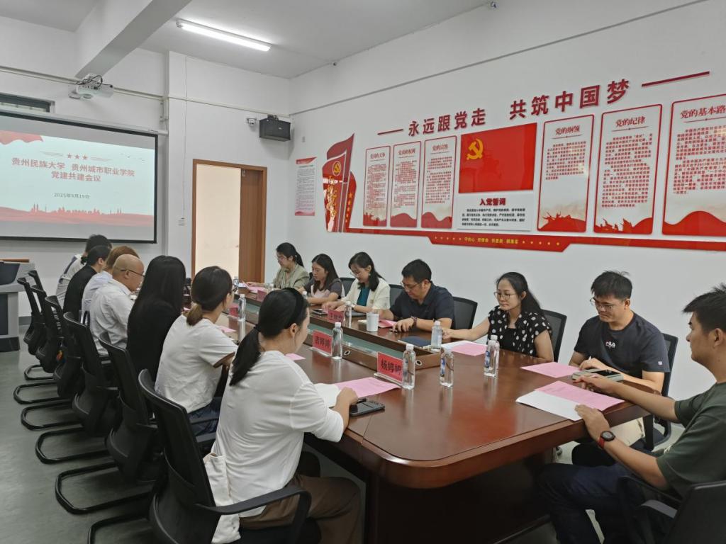 为深化党建引领,探索校际合作新模式,实现资源共享、优势互补,共同提升党建工作水平与教育教学质量。2025 年9月19日上午,贵州民族大学建筑工程学院与贵州城市职业学院城市管理学院党建共建会议在贵州民族大学建工楼 A505会议室举行。贵州民族大学建筑工程学院党委书记何璘,党委副书记、院长王林均,贵州城市职业学院城市管理学院党总支书记罗以雄、院长付慜出席会议,双方教师代表参加会议。会议由建筑工程学院党委副书记陆忠婷主持。